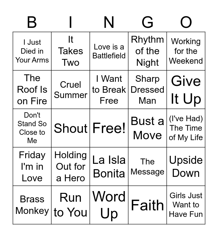 This bingo card has a free space and 41 words: We’re Not Gonna Take It, Don't Stand So Close to Me, Ghostbusters, Cruel Summer, Run to You, La Isla Bonita, I Want to Break Free, Higher Love, Working for the Weekend, Friday I'm in Love, Shout, Rhythm of the Night, Girls Just Want to Have Fun, (I've Had) The Time of My Life, Bust a Move, Holding Out for a Hero, Walk Like an Egyptian, I Just Died in Your Arms, Super Trouper, Love is a Battlefield, Upside Down, Let's Dance, Word Up, Sharp Dressed Man, Venus, Flashdance... What a Feeling, Faith, It's Tricky, Give It Up, Fight for Your Right, Apache, It Takes Two, Brass Monkey, Rapper's Delight, The Message, The Roof Is on Fire, Planet Rock, Lookout Weekend, Girls, You Sexy Thing and She Drives Me Crazy.