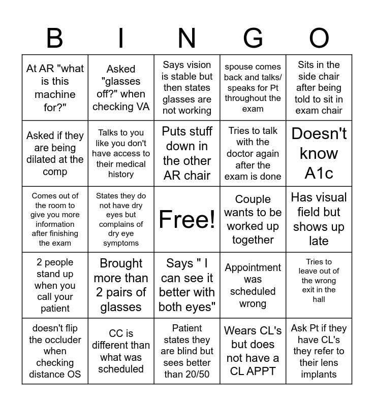 This bingo card has a free space and 24 words: Brought more than 2 pairs of glasses, CC is different than what was scheduled, Puts stuff down in the other AR chair, doesn't flip the occluder when checking distance OS, Sits in the side chair after being told to sit in exam chair, At AR "what is this machine for?", Asked if they are being dilated at the comp, Asked "glasses off?" when checking VA, Couple wants to be worked up together, Says " I can see it better with both eyes", Tries to talk with the doctor again after the exam is done, Comes out of the room to give you more information after finishing the exam, Appointment was scheduled wrong, Tries to leave out of the wrong exit in the hall, Talks to you like you don't have access to their medical history, Wears CL's but does not have a CL APPT, Has visual field but shows up late, Says vision is stable but then states glasses are not working, Doesn't know A1c, States they do not have dry eyes but complains of dry eye symptoms, Ask Pt if they have CL's they refer to their lens implants, 2 people stand up when you call your patient, spouse comes back and talks/ speaks for Pt throughout the exam and Patient states they are blind but sees better than 20/50.