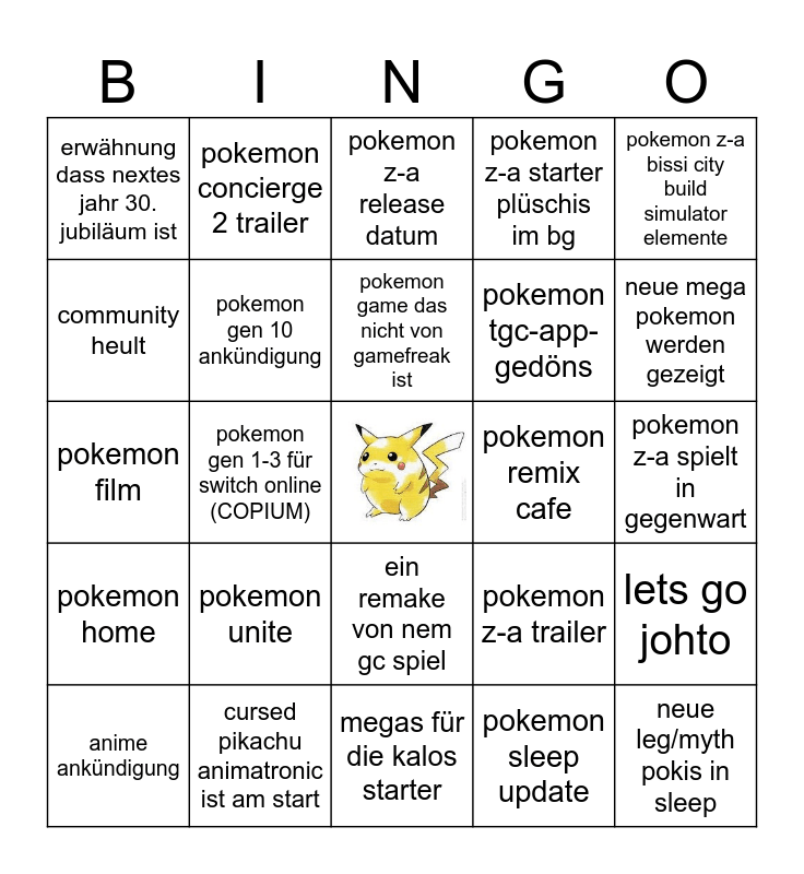This bingo card has a free space and 24 words: pokemon unite, cursed pikachu animatronic ist am start, pokemon game das nicht von gamefreak ist, anime ankündigung, pokemon z-a bissi city build simulator elemente, erwähnung dass nextes jahr 30. jubiläum ist, community heult, pokemon concierge 2 trailer, pokemon remix cafe, ein remake von nem gc spiel, pokemon tgc-app-gedöns, pokemon film, pokemon z-a trailer, lets go johto, pokemon gen 10 ankündigung, pokemon sleep update, pokemon z-a spielt in gegenwart, pokemon z-a release datum, neue mega pokemon werden gezeigt, pokemon gen 1-3 für switch online (COPIUM), neue leg/myth pokis in sleep, pokemon home, pokemon z-a starter plüschis im bg and megas für die kalos starter.
