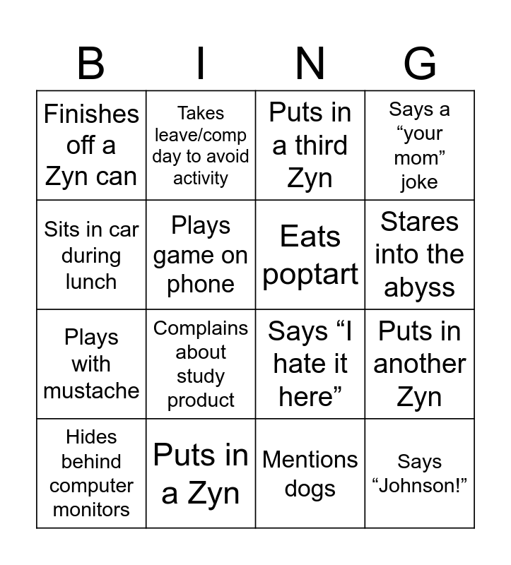 This bingo card has 16 words: Puts in a Zyn, Puts in another Zyn, Puts in a third Zyn, Finishes off a Zyn can, Plays with mustache, Takes leave/comp day to avoid activity, Says “I hate it here”, Mentions dogs, Sits in car during lunch, Plays game on phone, Hides behind computer monitors, Says a “your mom” joke, Complains about study product, Stares into the abyss, Eats poptart and Says “Johnson!”.