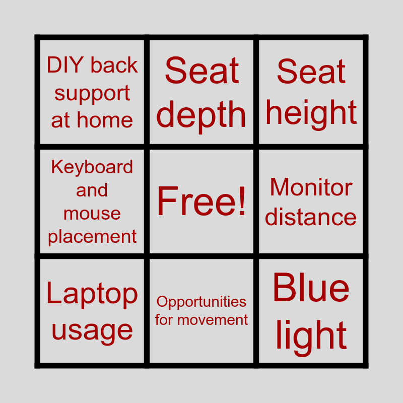 This bingo card has a free space and 24 words: Monitor position, Eye health, Opportunities for movement, Seat tilt, Blue light, DIY back support at home, Monitor distance, Seat depth, Sit-stand desks, Eye breaks, Fixed height desks, Back support, Wrist rests, Posture, Laptop usage, Keyboard and mouse technique, Webcams, Seat height, Foot support, Standing to work, Monitor height, Natural light, Keyboard and mouse placement and Regular breaks.