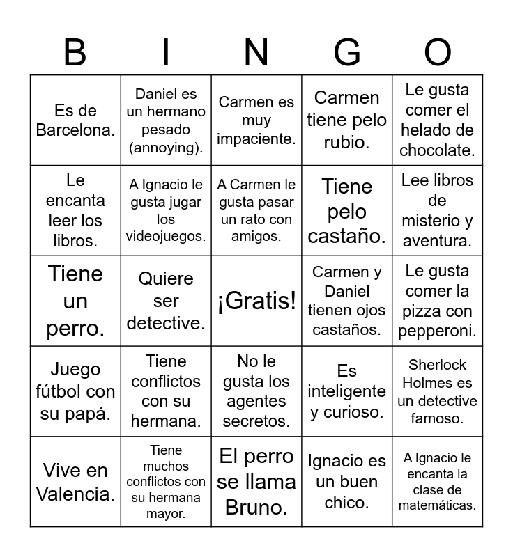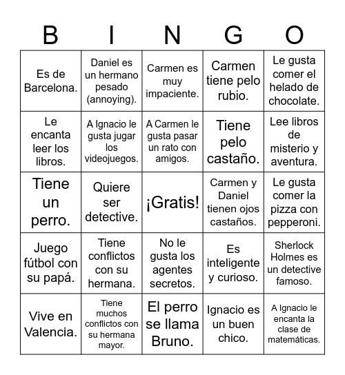 This bingo card has a free space and 24 words: Tiene conflictos con su hermana., Tiene muchos conflictos con su hermana mayor., A Carmen le gusta pasar un rato con amigos., Vive en Valencia., Le gusta comer el helado de chocolate., Es de Barcelona., Le encanta leer los libros., Daniel es un hermano pesado (annoying)., Carmen y Daniel tienen ojos castaños., No le gusta los agentes secretos., Tiene pelo castaño., Tiene un perro., Es inteligente y curioso., Sherlock Holmes es un detective famoso., A Ignacio le gusta jugar los videojuegos., Ignacio es un buen chico., Le gusta comer la pizza con pepperoni., Carmen es muy impaciente., Lee libros de misterio y aventura., Quiere ser detective., A Ignacio le encanta la clase de matemáticas., Juego fútbol con su papá., Carmen tiene pelo rubio. and El perro se llama Bruno..
