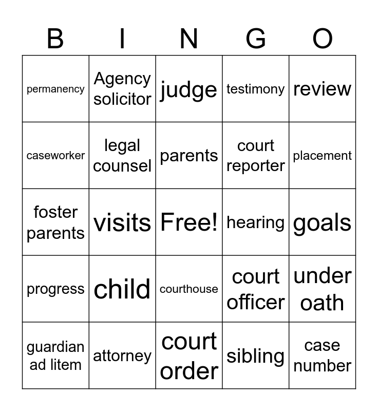 This bingo card has a free space and 24 words: child, attorney, parents, guardian ad litem, review, permanency, caseworker, Agency solicitor, hearing, courthouse, court reporter, foster parents, court officer, under oath, legal counsel, sibling, goals, judge, placement, visits, case number, progress, testimony and court order.