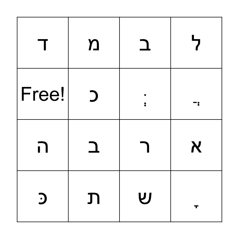 This bingo card has 16 words: ת, א, ב, ד, ה, מ, ר, ש, Free!, כ, כּ, ל, ב, ֲ, ּ ְ and ָ.
