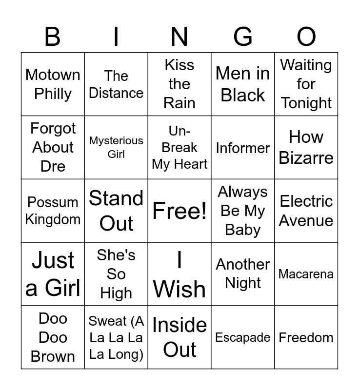 This bingo card has a free space and 46 words: Mr. Jones, Freedom, Doo-Wop (That Thing), Inside Out, She's So High, Walking on Broken Glass, The Distance, Hard Knock Life, Forgot About Dre, All I Wanna Do, Mysterious Girl, Men in Black, Macarena, Another Night, Save Tonight, Summertime, Un-Break My Heart, Always Be My Baby, You Make Me Wanna..., Waiting for Tonight, Stand Out, Escapade, Motown Philly, Informer, Groove Is in the Heart, How Bizarre, Doo Doo Brown, Tootsie Roll, I Wish, Just a Girl, Poison, Hip Hop Hooray, Finally, Doctor Jones, Push the Feeling On, Sweat (A La La La La Long), Electric Avenue, Standing Outside a Broken Phone Booth with Money in My Hand, Flagpole Sitta, Everything Falls Apart, Cumbersome, Kiss the Rain, Possum Kingdom, Right Here, Right Now, Stolen Car and I2I.
