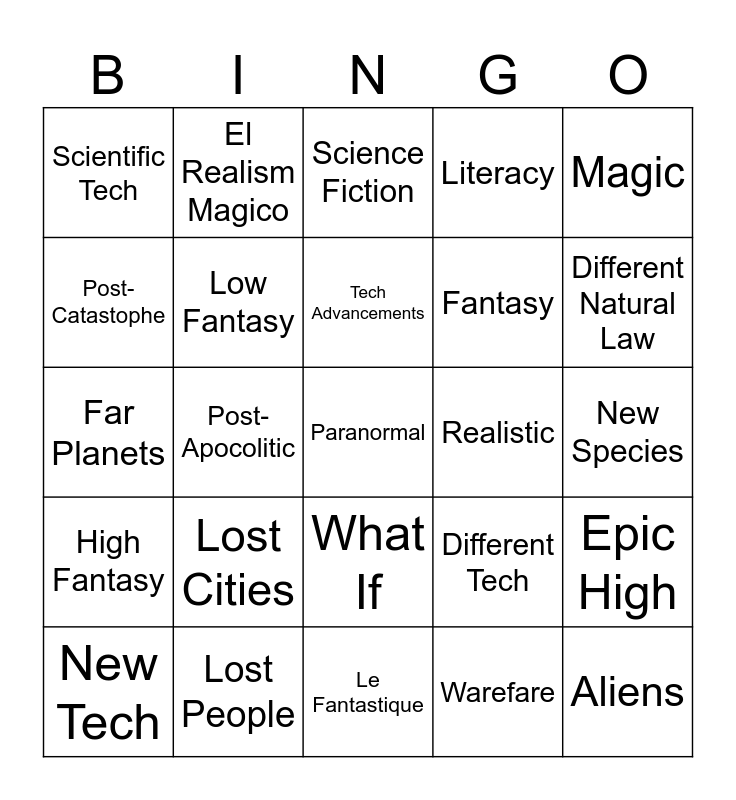 This bingo card has 30 words: Lost People, Far Galaxies, Post-Apocolitic, Different History, Scientific Tech, Science Fiction, Low Fantasy, What If, Realistic, Le Fantastique, New Species, Paranormal, Warefare, Aliens, Different Natural Law, I'hesitation, Different Tech, High Fantasy, Lost Cities, Magic, Far Planets, Speculative Fantasy, El Realism Magico, Fantasy, Post-Catastophe, Literacy, Epic High, New Tech, Tech Advancements and Historical.