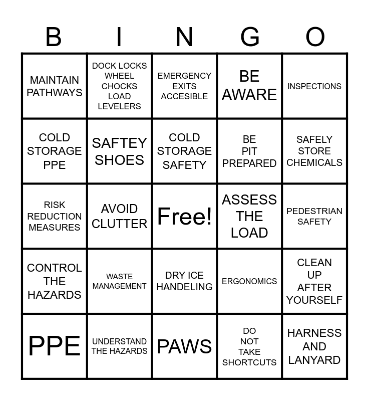 This bingo card has a free space and 24 words: PPE, WASTE MANAGEMENT, COLD STORAGE SAFETY, DO NOT TAKE SHORTCUTS, INSPECTIONS, MAINTAIN PATHWAYS, DOCK LOCKS WHEEL CHOCKS LOAD LEVELERS, EMERGENCY EXITS ACCESIBLE, ASSESS THE LOAD, PEDESTRIAN SAFETY, RISK REDUCTION MEASURES, SAFTEY SHOES, ERGONOMICS, CLEAN UP AFTER YOURSELF, COLD STORAGE PPE, UNDERSTAND THE HAZARDS, PAWS, BE AWARE, SAFELY STORE CHEMICALS, CONTROL THE HAZARDS, AVOID CLUTTER, DRY ICE HANDELING, BE PIT PREPARED and HARNESS AND LANYARD.