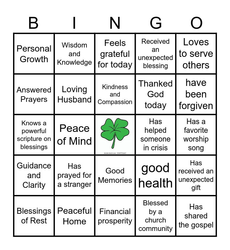 This bingo card has a free space and 54 words: Children, Guidance and Clarity, Ability to be generous, Strength in Adversity, Good Memories, Grand-children, Received an unexpected blessing, Safe Travels, Answered Prayers, Successful Career, Personal Growth, Comfort in Hard Times, Peaceful Home, Blessings of Rest, Good Friends, Financial prosperity, Has shared the gospel, Thanked God today, Has overcome a hardship with faith, Has a favorite worship song, good health, Good night's sleep, Has helped someone in crisis, Loves to serve others, Hope for the Future, Wisdom and Knowledge, Freedom and Liberty, Joy, Has received an answer to prayer, Blessed by a church community, Has blessed someone with kindness, Has a testimony of God's provision, Has forgiven someone recently, SALVATION, Feels grateful for today, Has felt God's peace in a storm, Knows a powerful scripture on blessings, Has received an unexpected gift, Finds joy in small things, Loving Husband, My Church, Pets, Discipleship, Family, Has prayed for a stranger, Good health, New Opportunities, Loving Relationships, Kindness and Compassion, Peace of Mind, have been forgiven, enjoyed a vacation, Coffee and Tea.