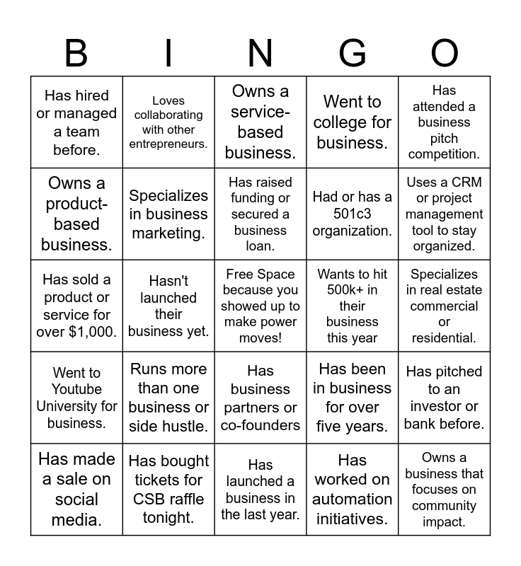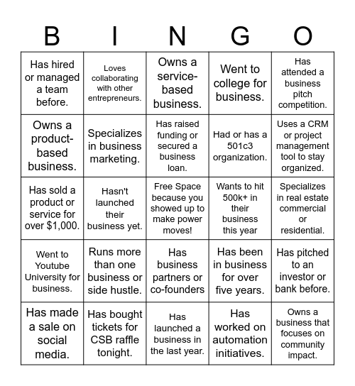 This bingo card has a free space and 25 words: Runs more than one business or side hustle., Has launched a business in the last year., Has raised funding or secured a business loan., Has made a sale on social media., Has attended a business pitch competition., Has hired or managed a team before., Owns a product-based business., Loves collaborating with other entrepreneurs., Wants to hit 500k+ in their business this year, Has business partners or co-founders, Had or has a 501c3 organization., Has sold a product or service for over $1,000., Has been in business for over five years., Has pitched to an investor or bank before., Specializes in business marketing., Has been featured in a media article or podcast., Specializes in real estate commercial or residential., Owns a service-based business., Uses a CRM or project management tool to stay organized., Hasn't launched their business yet., Owns a business that focuses on community impact., Has bought tickets for CSB raffle tonight., Went to Youtube University for business., Went to college for business. and Has worked on automation initiatives..