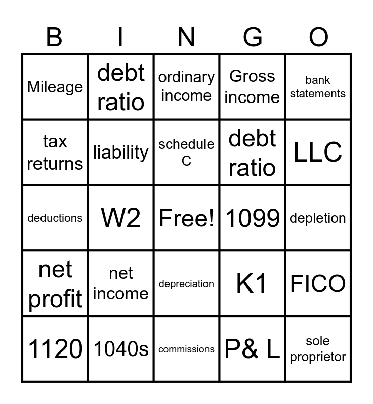 This bingo card has a free space and 24 words: net income, 1040s, schedule C, 1120, bank statements, Mileage, tax returns, debt ratio, 1099, depreciation, debt ratio, deductions, K1, FICO, liability, P& L, depletion, ordinary income, LLC, W2, sole proprietor, net profit, Gross income and commissions.