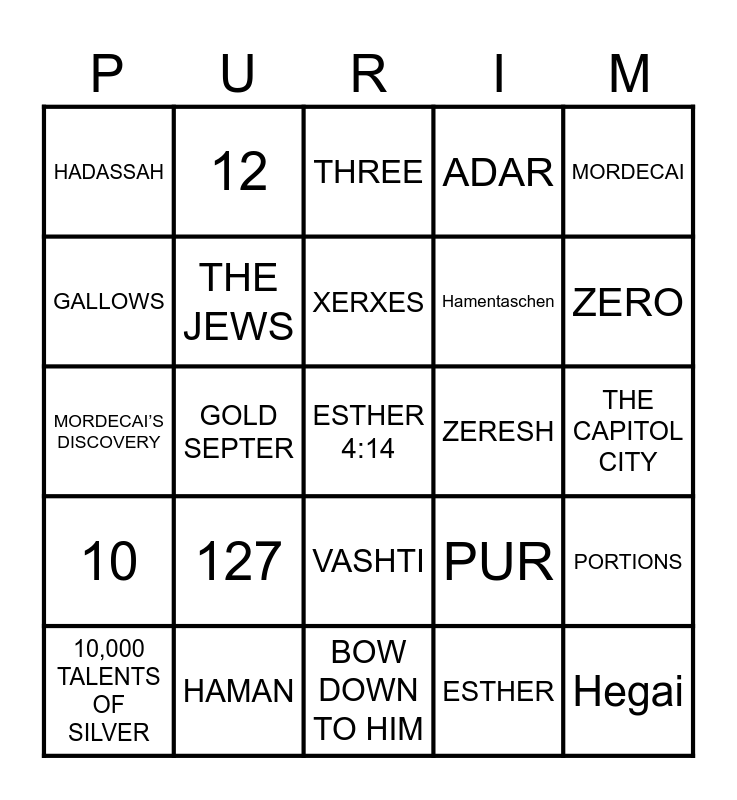 This bingo card has 26 words: VASHTI, ESTHER, XERXES, HAMAN, MORDECAI, HADASSAH, GALLOWS, 12, THE CAPITOL CITY, PUR, Hamentaschen, MORDECAI’S DISCOVERY, PORTIONS, 10,000 TALENTS OF SILVER, GOLD SEPTER, HAMAN’S PEOPLE, ADAR, 10, THREE, ESTHER 4:14, ZERO, BOW DOWN TO HIM, ZERESH, 127, THE JEWS and Hegai.