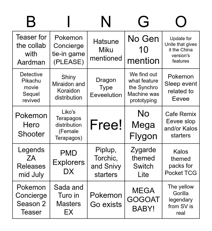 This bingo card has a free space and 24 words: PMD Explorers DX, Sada and Turo in Masters EX, Dragon Type Eeveelution, Pokemon Concierge Season 2 Teaser, Update for Unite that gives it the China version's features, Teaser for the collab with Aardman, Detective Pikachu movie Sequel revived, Pokemon Concierge tie-in game (PLEASE), No Mega Flygon, Piplup, Torchic, and Snivy starters, We find out what feature the Synchro Machine was prototyping, Pokemon Hero Shooter, Zygarde themed Switch Lite, Kalos themed packs for Pocket TCG, Shiny Miraidon and Koraidon distribution, MEGA GOGOAT BABY!, Cafe Remix Eevee slop and/or Kalos starters, Hatsune Miku mentioned, Pokemon Sleep event related to Eevee, Liko's Terapagos distribution (Female Terapagos), The yellow Gorilla legendary from SV is real, Legends ZA Releases mid July, No Gen 10 mention and Pokemon Go exists.