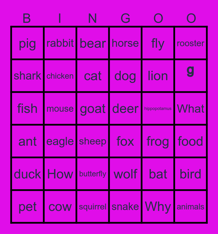 This bingo card has 36 words: wolf, butterfly, snake, shark, ant, deer, chicken, squirrel, fly, bat, g, horse, bird, mouse, dog, pig, duck, hippopotamus, fish, bear, goat, eagle, fox, sheep, frog, rabbit, lion, cow, cat, rooster, animals, pet, food, What, How and Why.