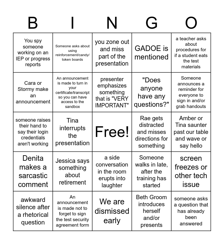 This bingo card has a free space and 24 words: Jessica says something about retirement, An announcement is made not to forget to sign the test security agreement form, presenter emphasizes something that is "VERY IMPORTANT", awkward silence after a rhetorical question, a teacher asks about procedures for if a student eats the test materials, You spy someone working on an IEP or progress reports, Cara or Stormy make an announcement, Someone asks about using reinforcement/candy/ token boards, Rae gets distracted and misses directions for something, a side conversation in the room erupts into laughter, "Does anyone have any questions?", someone raises their hand to say their login credentials aren't working, Someone walks in late, after the training has started, screen freezes or other tech issue, An announcement is made to turn in your certificate/transcript so you can have access to the sandbox, Beth Groom introduces herself and/or presents, Amber or Tina saunter past our table and wave or say hello, you zone out and miss part of the presentation, Someone announces a reminder for everyone to sign in and/or grab handouts, Tina interrupts the presentation, someone asks a question that has already been answered, Denita makes a sarcastic comment, GADOE is mentioned and We are dismissed early.