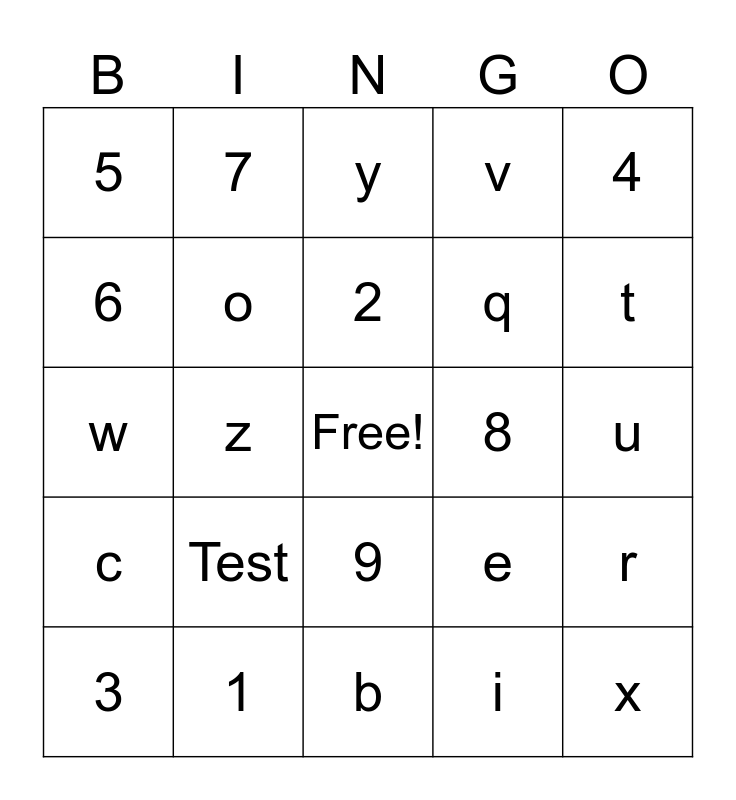 This bingo card has a free space and 24 words: Test, 1, 2, 3, 4, 5, 6, 7, 8, 9, q, w, e, r, o, i, u, y, t, z, x, c, v and b.
