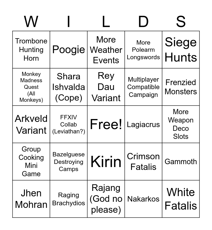 This bingo card has a free space and 24 words: Bazelguese Destroying Camps, Raging Brachydios, Rey Dau Variant, Jhen Mohran, Siege Hunts, Trombone Hunting Horn, Monkey Madness Quest (All Monkeys), Poogie, Lagiacrus, Kirin, Multiplayer Compatible Campaign, Arkveld Variant, Crimson Fatalis, Gammoth, Shara Ishvalda (Cope), Nakarkos, More Weapon Deco Slots, More Weather Events, Frenzied Monsters, FFXIV Collab (Leviathan?), White Fatalis, Group Cooking Mini Game, More Polearm Longswords and Rajang (God no please).