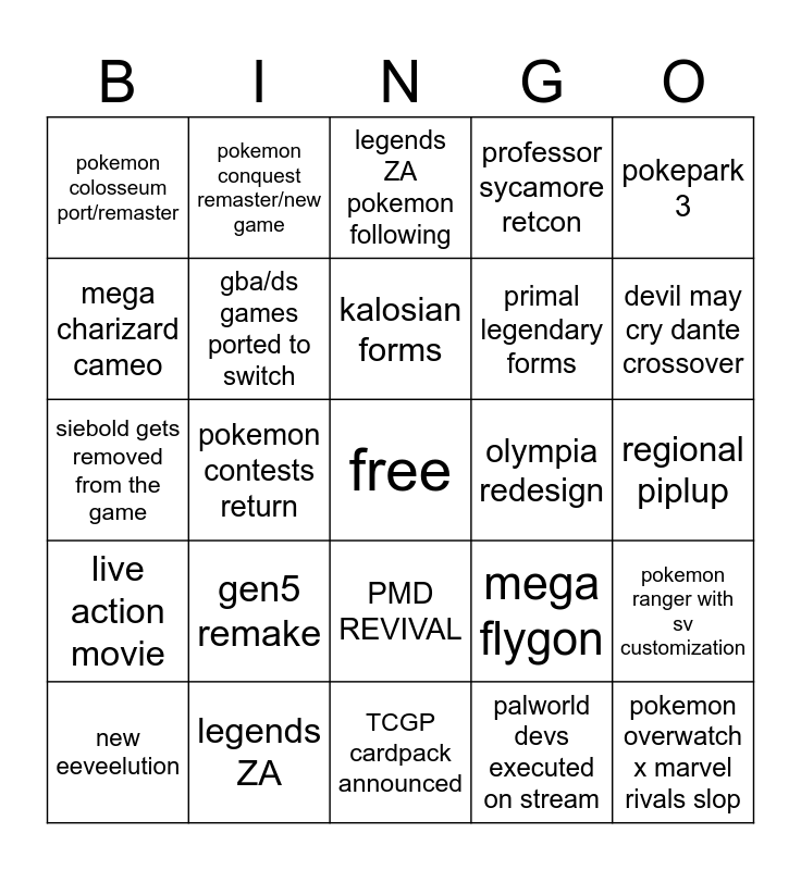 This bingo card has a free space and 24 words: gen5 remake, legends ZA, kalosian forms, new eeveelution, pokepark 3, pokemon colosseum port/remaster, mega charizard cameo, pokemon conquest remaster/new game, olympia redesign, PMD REVIVAL, primal legendary forms, siebold gets removed from the game, mega flygon, pokemon ranger with sv customization, gba/ds games ported to switch, palworld devs executed on stream, regional piplup, legends ZA pokemon following, devil may cry dante crossover, pokemon contests return, pokemon overwatch x marvel rivals slop, live action movie, professor sycamore retcon and TCGP cardpack announced.