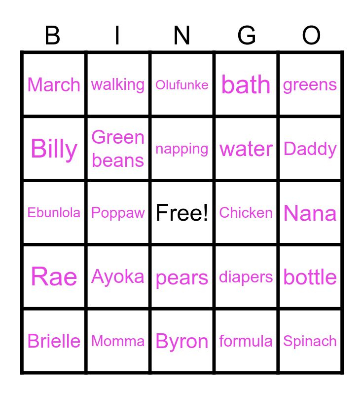 This bingo card has a free space and 29 words: Brielle, Carrots, Poppaw, Sharon, March, Olufunke, Green beans, Ayoka, Chicken, Momma, Nana, Spinach, Byron, formula, Daddy, Grandma (T), pears, Rae, greens, Ebunlola, diapers, apples, water, Billy, bath, walking, bottle, napping and playpen.