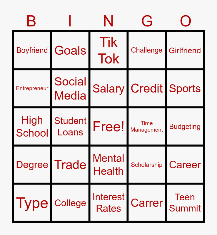 This bingo card has a free space and 24 words: Trade, College, Salary, Type, Girlfriend, Boyfriend, Entrepreneur, Goals, Time Management, Mental Health, Credit, High School, Scholarship, Career, Social Media, Carrer, Budgeting, Tik Tok, Sports, Student Loans, Teen Summit, Degree, Challenge and Interest Rates.