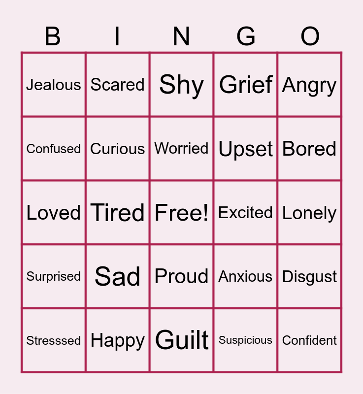 This bingo card has a free space and 24 words: Sad, Happy, Worried, Stresssed, Angry, Jealous, Confused, Scared, Excited, Proud, Upset, Loved, Anxious, Disgust, Curious, Suspicious, Lonely, Shy, Bored, Tired, Confident, Surprised, Grief and Guilt.