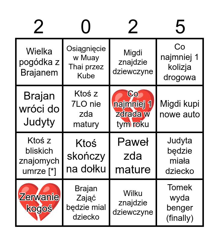 This bingo card has 2 images and 16 words: Brajan Zająć będzie mial dziecko, Judyta będzie miała dziecko, Migdi znajdzie dziewczyne, Wielka pogódka z Brajanem, Ktoś z bliskich znajomych umrze [*], Osiągnięcie w Muay Thai przez Kube, Paweł zda mature, Wilku znajdzie dziewczyne, Brajan wróci do Judyty, Ktoś z 7LO nie zda matury, Zerwanie kogoś, Co najmniej 1 kolizja drogowa, Ktoś skończy na dołku, Migdi kupi nowe auto, Co najmniej 1 zdrada w tym roku and Tomek wyda benger (finally).