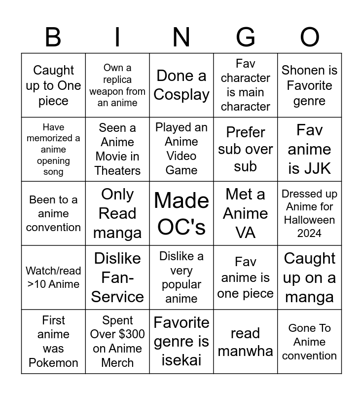 This bingo card has a free space and 36 words: Never seen Any Big 3 shows, Used to hate Anime, Play/Collect an anime TCG, Seen a Anime Movie in Theaters, Fav anime is one piece, Watch/read >10 Anime, Played an Anime Video Game, Finished a Parody, Shonen is Favorite genre, Follow Otakus Anonymous, Only Read manga, Fav character is main character, Haven't read Manga, Met a Anime VA, Fav anime is JJK, Caught up to One piece, Started Watching in 2024, Dislike Fan-Service, Gone To Anime convention, Done a Cosplay, Dressed up Anime for Halloween 2024, Caught up on a manga, Spent Over $300 on Anime Merch, First anime was Pokemon, Favorite genre is isekai, Own a replica weapon from an anime, Been to a anime convention, Prefer sub over dub, Prefer sub over sub, Have memorized a anime opening song, Play anime video games, Have been to japan, read manwha, Dislike a very popular anime, Free space and Made your own voice over.