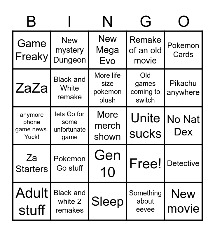 This bingo card has 25 words: Pokemon Go stuff, Sleep, More life size pokemon plush, Adult stuff, Pokemon Cards, Game Freaky, ZaZa, New mystery Dungeon, Unite sucks, Gen 10, Old games coming to switch, anymore phone game news. Yuck!, Free!, Detective, Black and White remake, New movie, No Nat Dex, New Mega Evo, Pikachu anywhere, lets Go for some unfortunate game, More merch shown, Black and white 2 remakes, Za Starters, Remake of an old movie and Something about eevee.