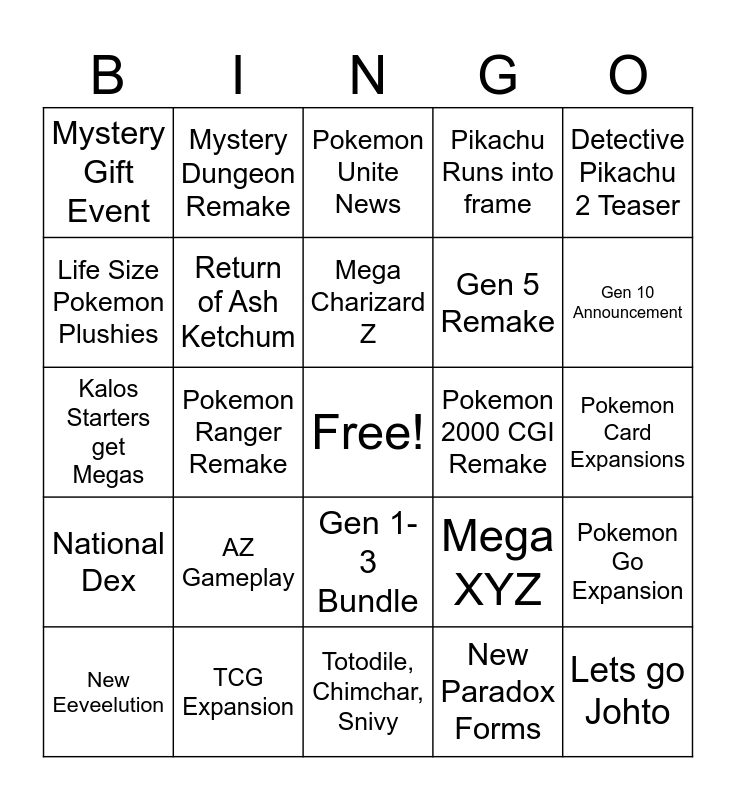 This bingo card has a free space and 24 words: AZ Gameplay, TCG Expansion, Mega Charizard Z, New Eeveelution, Detective Pikachu 2 Teaser, Mystery Gift Event, Life Size Pokemon Plushies, Mystery Dungeon Remake, Pokemon 2000 CGI Remake, Gen 1-3 Bundle, Gen 5 Remake, Kalos Starters get Megas, Mega XYZ, Pokemon Go Expansion, Return of Ash Ketchum, New Paradox Forms, Pokemon Card Expansions, Pokemon Unite News, Gen 10 Announcement, Pokemon Ranger Remake, Lets go Johto, National Dex, Pikachu Runs into frame and Totodile, Chimchar, Snivy.