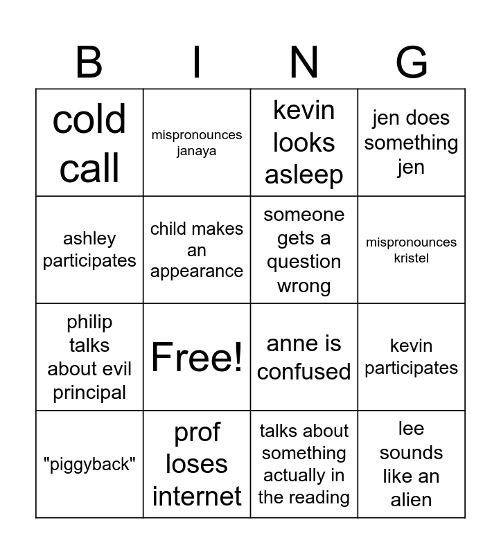 This bingo card has 18 words: Free!, lee sounds like an alien, kevin looks asleep, cold call, anne is confused, jen does something jen, "piggyback", mispronounces janaya, mispronounces kristel, philip talks about evil principal, talks about something actually in the reading, ashley participates, kevin participates, child makes an appearance, someone gets a question wrong, pet on screen, prof loses internet and someone loses poker face.