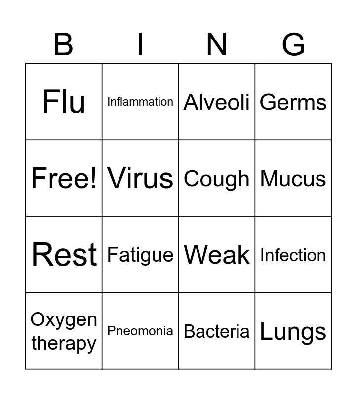 This bingo card has 16 words: Pneomonia, Infection, Alveoli, Flu, Rest, Inflammation, Weak, Bacteria, Free!, Virus, Oxygen therapy, Germs, Fatigue, Mucus, Cough and Lungs.
