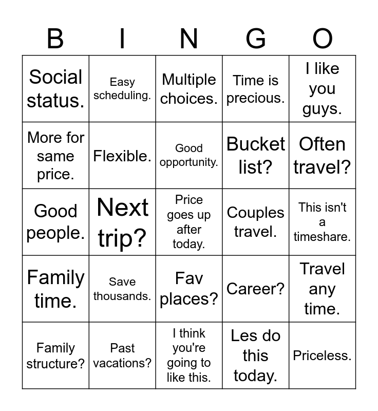 This bingo card has a free space and 24 words: Family structure?, Save thousands., Good opportunity., Les do this today., I like you guys., Social status., Easy scheduling., Multiple choices., Couples travel., This isn't a timeshare., Good people., Flexible., Career?, Travel any time., More for same price., Past vacations?, I think you're going to like this., Time is precious., Often travel?, Family time., Next trip?, Fav places?, Bucket list? and Priceless..