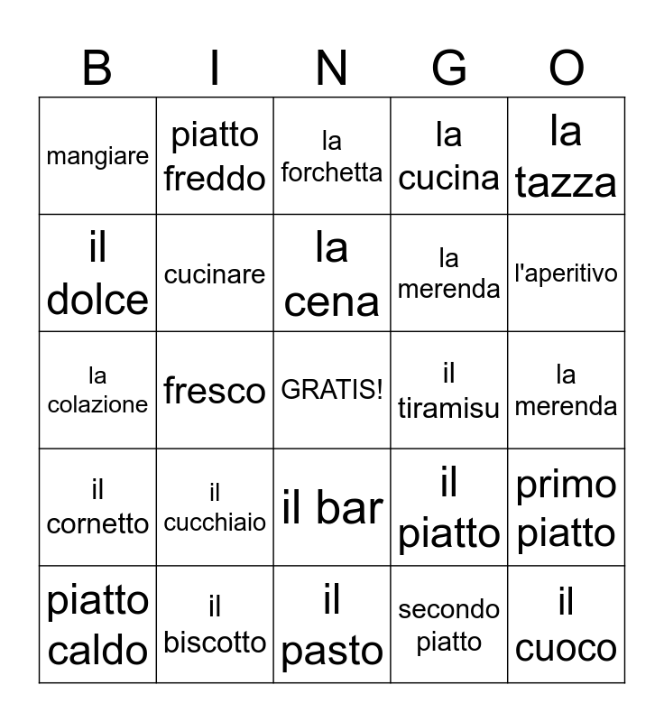 This bingo card has a free space and 24 words: il cucchiaio, il biscotto, la cena, piatto caldo, la tazza, mangiare, il dolce, piatto freddo, il tiramisu, il bar, la merenda, la colazione, il piatto, primo piatto, cucinare, secondo piatto, la merenda, la forchetta, l'aperitivo, fresco, il cuoco, il cornetto, la cucina and il pasto.