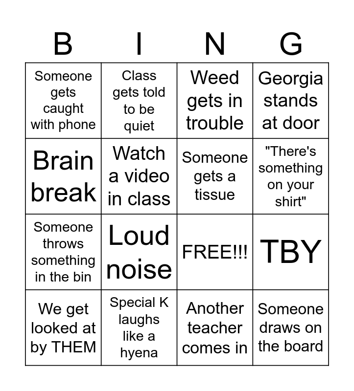 This bingo card has 16 words: Special K laughs like a hyena, TBY, Weed gets in trouble, Someone gets caught with phone, Someone throws something in the bin, Class gets told to be quiet, FREE!!!, Another teacher comes in, Brain break, Watch a video in class, We get looked at by THEM, Georgia stands at door, Loud noise, "There's something on your shirt", Someone gets a tissue and Someone draws on the board.