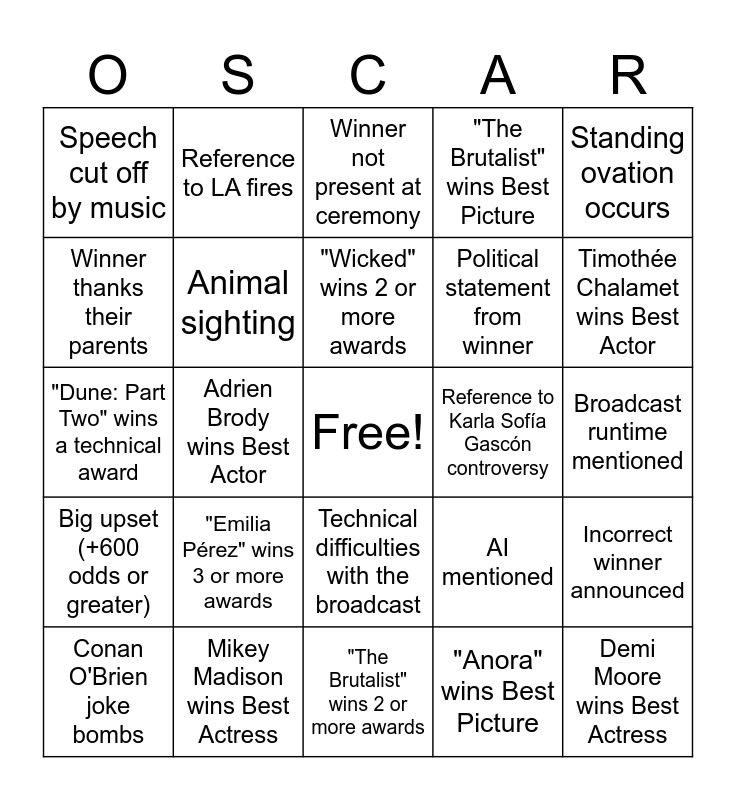 This bingo card has a free space and 25 words: "Emilia Pérez" wins 3 or more awards, "The Brutalist" wins 2 or more awards, "Wicked" wins 2 or more awards, Conan O'Brien joke bombs, Standing ovation occurs, Speech cut off by music, Winner thanks their parents, Reference to LA fires, Reference to Karla Sofía Gascón controversy, Technical difficulties with the broadcast, Political statement from winner, "Dune: Part Two" wins a technical award, AI mentioned, Incorrect winner announced, Animal sighting, "The Brutalist" long runtime mentioned, Broadcast runtime mentioned, Winner not present at ceremony, Timothée Chalamet wins Best Actor, Adrien Brody wins Best Actor, Demi Moore wins Best Actress, Mikey Madison wins Best Actress, Big upset (+600 odds or greater), "The Brutalist" wins Best Picture and "Anora" wins Best Picture.