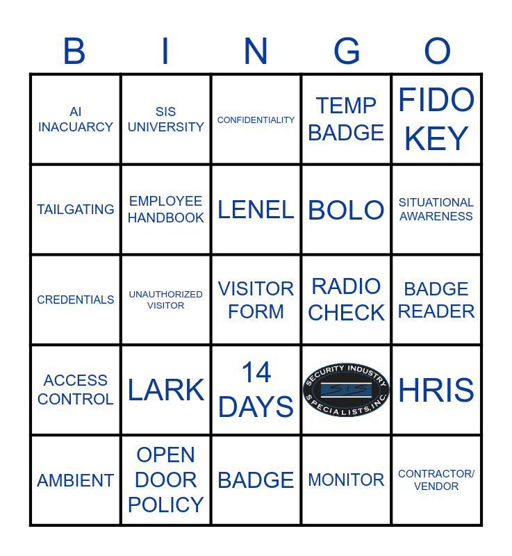 This bingo card has 1 images and 24 words: LARK, BADGE, LENEL, AMBIENT, FIDO KEY, AI INACUARCY, TAILGATING, SIS UNIVERSITY, RADIO CHECK, 14 DAYS, BOLO, CREDENTIALS, HRIS, EMPLOYEE HANDBOOK, CONTRACTOR/ VENDOR, BADGE READER, CONFIDENTIALITY, SITUATIONAL AWARENESS, UNAUTHORIZED VISITOR, VISITOR FORM, OPEN DOOR POLICY, ACCESS CONTROL, TEMP BADGE and MONITOR.