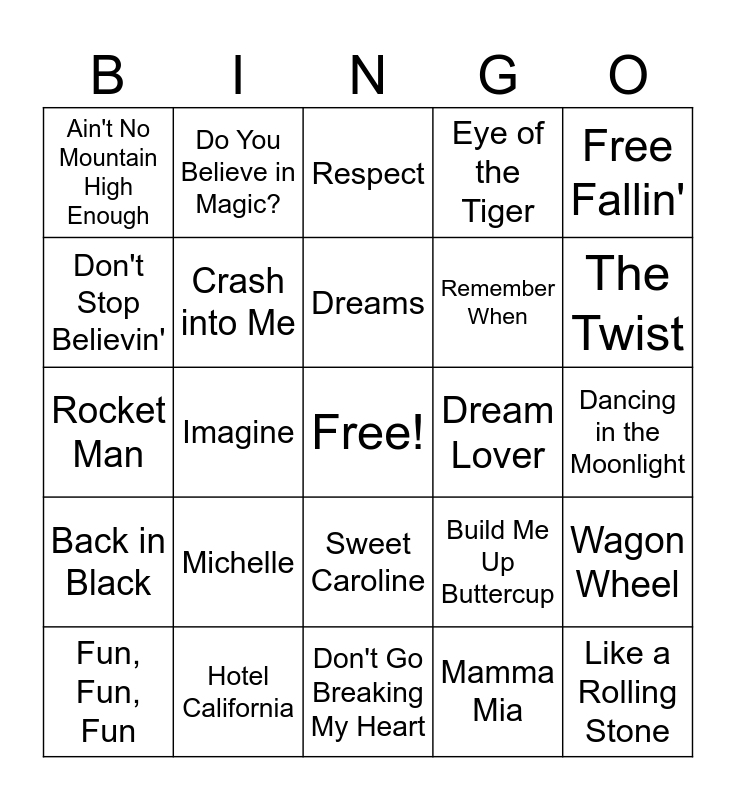 This bingo card has a free space and 73 words: ABC, Africa, Ain't No Mountain High Enough, All Night Long, Amazing Grace, Another One Bites The Dust, Back in Black, Born in the U.S.A., Build Me Up Buttercup, Burning Love, California Dreamin', Comfortable Numb, Crash into Me, Dancing in the Moonlight, Dancing Queen, Do You Believe in Magic?, Don't Go Breaking My Heart, Don't Stop Believin', Don't Worry Be Happy, Dream Lover, Dreams, Eye of the Tiger, Free Fallin', Friends in Low Places, Fun, Fun, Fun, Girls Just Want to Have Fun, Happy Together, Have you Ever Seen The Rain, Here Comes The Sun, Hit the Road Jack, Hotel California, Hound Dog, House of the Rising Sun, Hungry Like The Wolf, Imagine, Jailhouse Rock, Johnny B. Goode, Lady, Like a Rolling Stone, Louie Louie, Mamma Mia, Michelle, My Girl, Night Fever, Play That Funky Music, Remember When, Respect, Ring of Fire, Rock and Roll All Nite, Rocket Man, Rockin' Robin, Rocky Mountain High, Seven Nation Army, Stand By Me, Sugar, Sugar, Superstition, Surfin' U.S.A, Sweet Caroline, Sweet Dreams, Sweet Home Alabama, Take on Me, Tennessee Whiskey, The Dance, The Twist, Tiny Dancer, Twist and Shout, Two Tickets to Paradise, Viva La Vida, Wagon Wheel, Wake Up Call, We Will Rock You, What is Love and You Give Love A Bad Name.