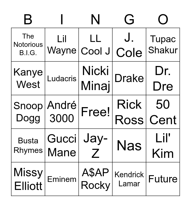 This bingo card has a free space and 26 words: Jay-Z, Kendrick Lamar, Nicki Minaj, Eminem, Tupac Shakur, The Notorious B.I.G., Kanye West, Lil Wayne, 50 Cent, Nas, Drake, Snoop Dogg, Lil' Kim, Missy Elliott, André 3000, DMX, J. Cole, Busta Rhymes, LL Cool J, Future, Dr. Dre, A$AP Rocky, Rick Ross, Gucci Mane, Ludacris and T.I..