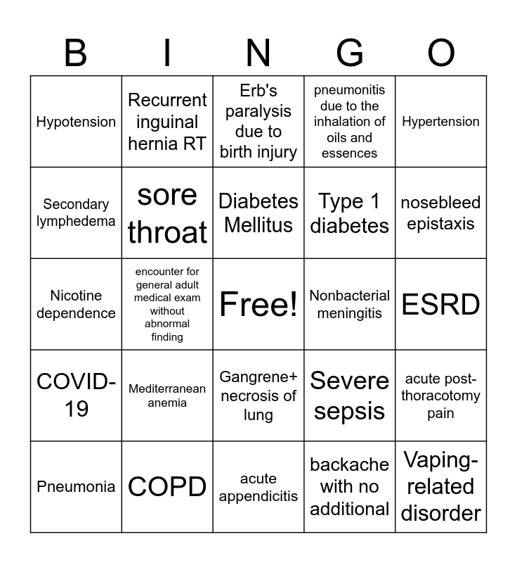 This bingo card has a free space and 24 words: Mediterranean anemia, COPD, Diabetes Mellitus, Pneumonia, Hypertension, Hypotension, Secondary lymphedema, Recurrent inguinal hernia RT, Nonbacterial meningitis, Gangrene+ necrosis of lung, Type 1 diabetes, Nicotine dependence, Severe sepsis, acute post-thoracotomy pain, sore throat, backache with no additional, ESRD, Erb's paralysis due to birth injury, nosebleed epistaxis, encounter for general adult medical exam without abnormal finding, Vaping-related disorder, COVID-19, pneumonitis due to the inhalation of oils and essences and acute appendicitis.