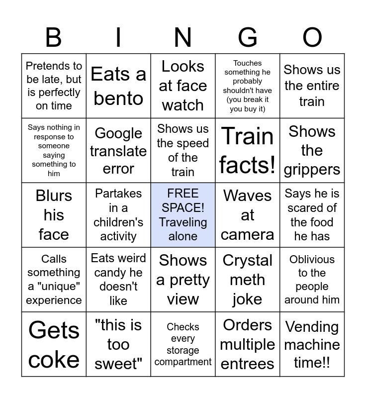 This bingo card has a free space and 24 words: Eats weird candy he doesn't like, "this is too sweet", Shows us the speed of the train, Gets coke, Shows us the entire train, Pretends to be late, but is perfectly on time, Says nothing in response to someone saying something to him, Eats a bento, Waves at camera, Shows a pretty view, Train facts!, Blurs his face, Crystal meth joke, Oblivious to the people around him, Google translate error, Orders multiple entrees, Says he is scared of the food he has, Looks at face watch, Shows the grippers, Partakes in a children's activity, Vending machine time!!, Calls something a "unique" experience, Touches something he probably shouldn't have (you break it you buy it) and Checks every storage compartment.