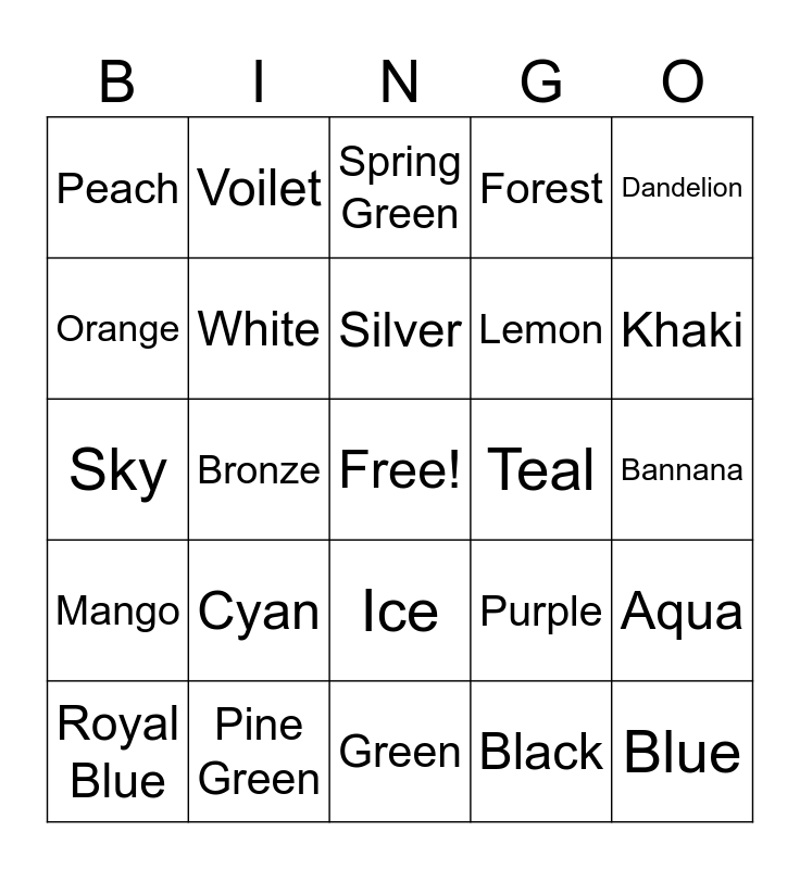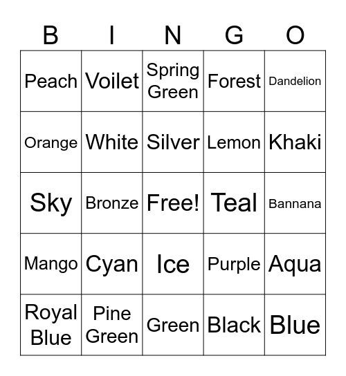 This bingo card has a free space and 50 words: Red, Blue, Maroon, Green, Cyan, Indigo, Voilet, Yellow, Orange, Pink, White, Forest, Aqua, Purple, Gold, Gray, Silver, Teal, Brown, Dandelion, Bronze, Black, Peach, Lemon, Mahogany, Tangerine, Khaki, Tan, Spring Green, Ice, Lavender, Ruby, Amber, Navy, Pine Green, Olive, Platinum, Rose, Coral, Bannana, Mint, Lime, Crimson, Plum, Royal Blue, Sky, Mangenta, Fushia, Mango and Jade.