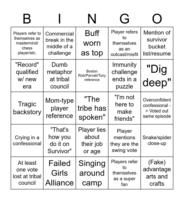 This bingo card has a free space and 24 words: "That's how you do it on Survivor", Failed Girls Alliance, Boston Rob/Parvati/Tony reference, At least one vote lost at tribal council, Mention of survivor bucket list/resume, Players refer to themselves as mastermind/ chess player/etc., "Record" qualified w/ new era, Commercial break in the middle of a challenge, "I'm not here to make friends", Player lies about their job or age, Immunity challenge ends in a puzzle, Tragic backstory, Player mentions they are the swing vote, Snake/spider close-up, Dumb metaphor at tribal council, Players refer to themselves as a super fan, Overconfident confessional -> Voted out same episode, Buff worn as top, "Dig deep", Mom-type player reference, (Fake) advantage arts and crafts, Crying in a confessional, Player refers to themselves as an outcast/misfit and Singing around camp.