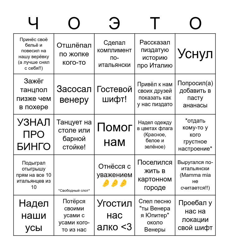 This bingo card has 25 words: Подыграл отыгрышу прям на все 10 итальянцев из 10, Потёрся своими усами с усами кого-то из нас, Помог нам, Спел песню "ты Венера я Юпитер" около Венеры, Уснул, Принёс своё бельё и повесил на нашу верёвку (а лучше снял с себя!!), Отшлёпал по жопке кого-то, Сделал комплимент по-итальянски, Надел одежду в цветах флага (Красное, белое и зелёное), Выругался по-итальянски (Mamma mia не считается!!), Зажёг танцпол пизже чем в похере, Засосал венеру, Угостил нас алко <3, Поселился жить в картонном городе, Попросил(а) добавить в пасту ананасы, Надел наши усы, Танцует на столе или барной стойке!, Гостевой шифт!, Привёл к нам своих друзей показать как у нас пиздато, *отдать кому-то у кого грустное настроение*, УЗНАЛ ПРО БИНГО, *Свободный слот*, Отнёсся с уважением🤌🤌🤌, Рассказал пиздатую историю про Италию and Проебал у нас на локации свой шифт.