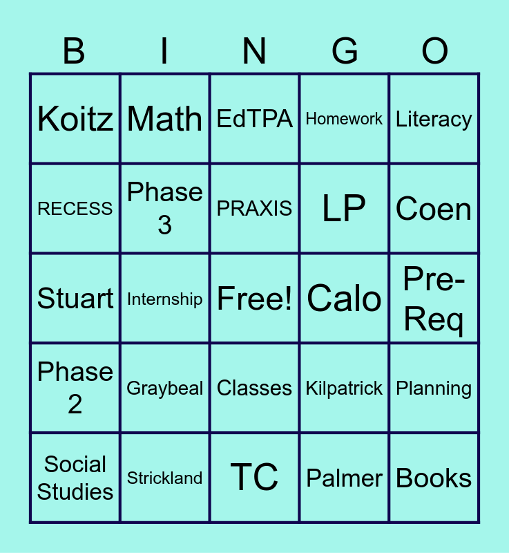 This bingo card has a free space and 33 words: Education, Students, Internship, Phase 1, Phase 2, Phase 3, Literacy, Social Studies, Math, Science, PRAXIS, EdTPA, My Why..., Learning, Calo, Coen, Strickland, Stuart, Graybeal, Kilpatrick, Classes, Grove, Koitz, Pre-Req, TC, Books, Homework, LP, RECESS, Planning, Tired, Palmer and Bat :).