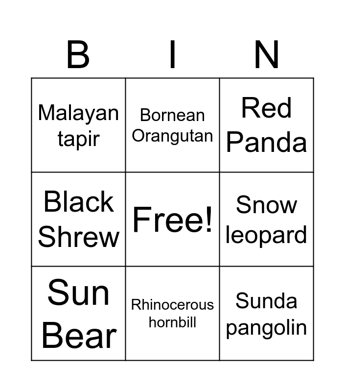 This bingo card has a free space and 14 words: Proboscis monkey, Malayan tiger, Sun Bear, Bornean Orangutan, Black Shrew, Sunda pangolin, Sumatran, Malaysian Giant Turtle, Rhinocerous hornbill, Malayan tapir, Blue whale, Snow leopard, Red Panda and River gorilla.