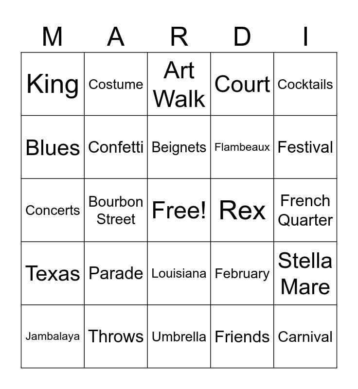 This bingo card has a free space and 75 words: Alligator, Aquarius, Art Walk, Ash Wednesday, Babalu, Baby, Bachus, Balcony, Ball, Bar, Barn Bash, Beads, Beignets, Blues, Boa, Bourbon Street, Cajun, Carnival, Celebration, Cocktails, Coconuts, Concerts, Confetti, Costume, Court, Crawfish, Crown, Dancing, Debutante, Doubloons, Fat Tuesday, Feasting, Feathers, February, Festival, Flambeaux, Fleur De Lis, Float, French Quarter, Friends, Galveston, Gold, Green, Gumbo, Jazz, Jester, Jambalaya, King, King Cake, Krewe, Lent, Louisiana, Lundi Gras, Marching Band, Mardi Gras, Mask, Masquerade, Music, New Orleans, Pancake Tuesday, Parade, Party Time, Performers, Purple, Queen, Rex, Seafood Boil, Shrove Tuesday, Spirits, Stella Mare, Texas, Throws, Traditions, Umbrella and Zulu.
