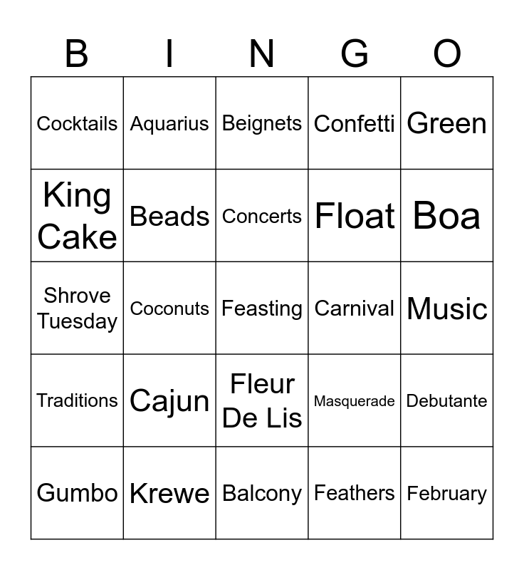 This bingo card has 80 words: Free!, Alligator, Aquarius, Art Walk, Ash Wednesday, Babalu, Baby, Bachus, Balcony, Ball, Bar, Barn Bash, Beads, Beignets, Blues, Boa, Bourbon Street, Cajun, Captain, Carnival, Celebration, Cocktails, Coconuts, Concerts, Confetti, Costume, Court, Crawfish, Crown, Dancing, Debutante, Doubloons, Fat Tuesday, Feasting, Feathers, February, Festival, Flambeaux, Fleur De Lis, Float, Food, French Quarter, Friends, Galveston, Gold, Green, Gumbo, Jazz, Jester, Jambalaya, King, King Cake, Krewe, Lent, Louisiana, Lundi Gras, Marching Band, Mardi Gras, Mask, Masquerade, Music, New Orleans, Pancake Tuesday, Parade, Party Time, Performers, Procession, Purple, Queen, Rex, Seafood Boil, Shrove Tuesday, Spirits, Stella Mare, Texas, Throws, Traditions, Umbrella, Vendors and Zulu.