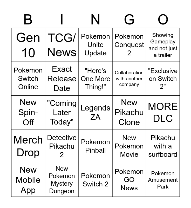 This bingo card has a free space and 24 words: Detective Pikachu 2, New Pokemon Mystery Dungeon, "Here's One More Thing!", New Mobile App, Showing Gameplay and not just a trailer, Gen 10, Pokemon Switch Online, TCG/ News, New Pikachu Clone, Pokemon Pinball, Collaboration with another company, New Spin-Off, New Pokemon Movie, Pikachu with a surfboard, Exact Release Date, Pokemon GO News, MORE DLC, Pokemon Unite Update, "Exclusive on Switch 2", "Coming Later Today", Pokemon Amusement Park, Merch Drop, Pokemon Conquest 2 and Pokemon Switch 2.