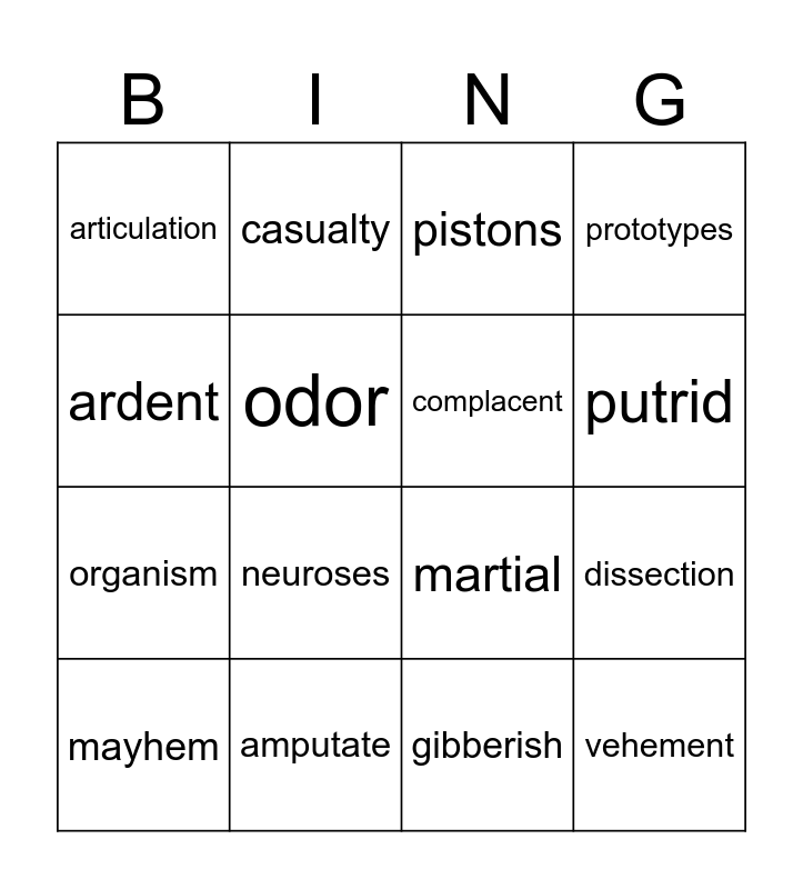 This bingo card has 16 words: amputate, dissection, pistons, articulation, organism, casualty, martial, gibberish, ardent, odor, mayhem, prototypes, neuroses, putrid, complacent and vehement.
