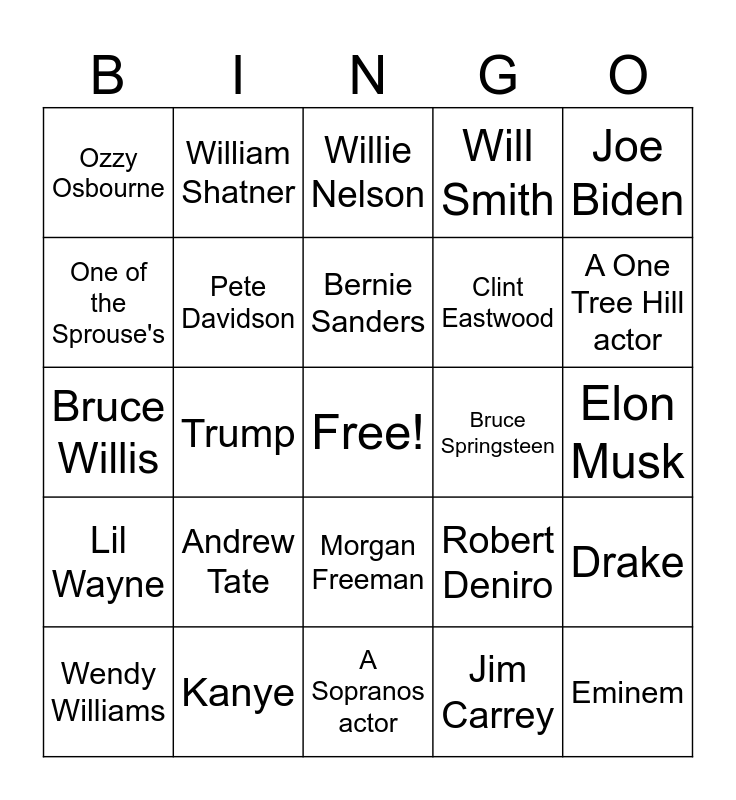 This bingo card has a free space and 24 words: Andrew Tate, Kanye, Bernie Sanders, Wendy Williams, Joe Biden, Ozzy Osbourne, One of the Sprouse's, William Shatner, Bruce Springsteen, Morgan Freeman, Clint Eastwood, Bruce Willis, Robert Deniro, Drake, Pete Davidson, Jim Carrey, Elon Musk, Willie Nelson, A One Tree Hill actor, Trump, Eminem, Lil Wayne, Will Smith and A Sopranos actor.