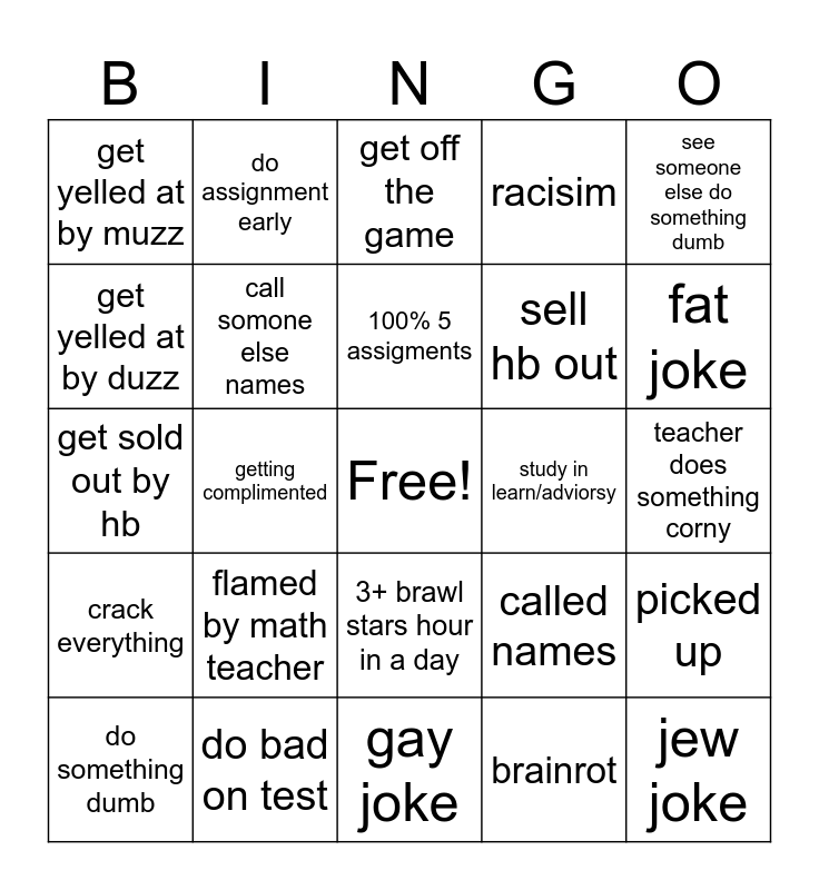 This bingo card has a free space and 24 words: flamed by math teacher, do bad on test, 100% 5 assigments, do something dumb, see someone else do something dumb, get yelled at by muzz, get yelled at by duzz, do assignment early, study in learn/adviorsy, 3+ brawl stars hour in a day, sell hb out, get sold out by hb, called names, picked up, call somone else names, brainrot, teacher does something corny, get off the game, fat joke, getting complimented, jew joke, crack everything, racisim and gay joke.